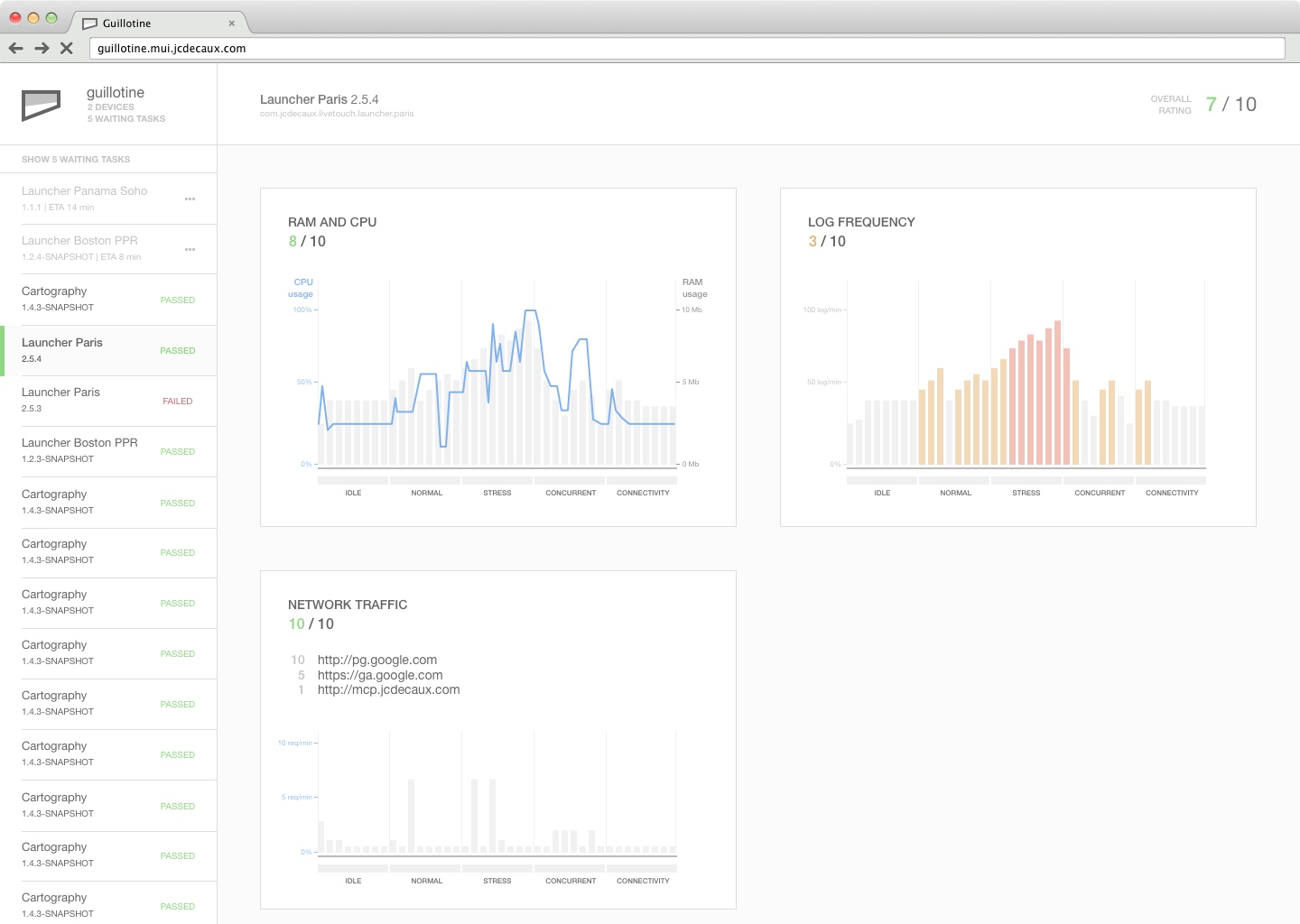 Guillotine is an automated testing platform for Android applications. It manages multiple connected devices through ADB, and tests APKs by installing them on the device and monitoring RAM, CPU, leaks, crashes, etc.. while smartly simulating touch events or reproducing a pre-recorded touch scenarios. Technically, this project was a good fit for me, it required Android skills to know how and what to test on APKs, backend skills to properly architecture the server side and web skills to generate an appealing administration board with many graphs and reports.